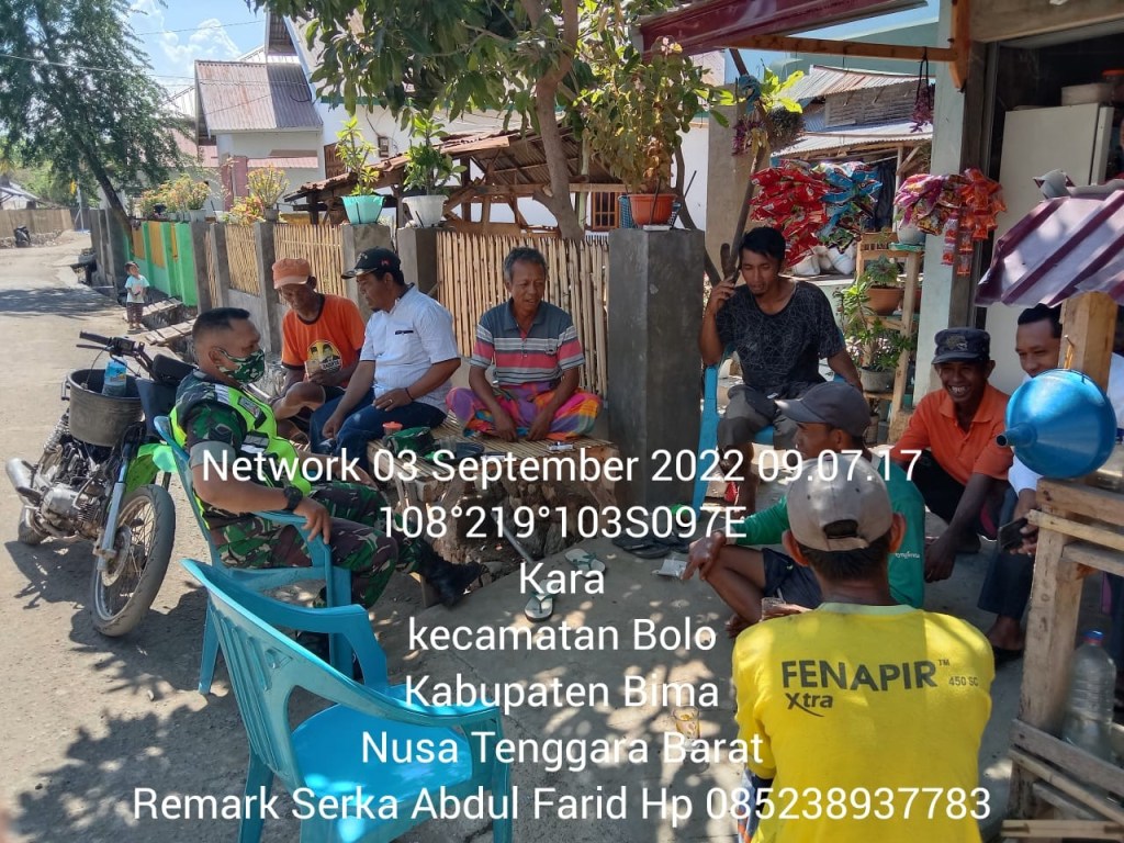 Kali ini Di wilayah Kecamatan Bolo Kabupaten Bima tepatnya di Desa Kara Anggota Koramil 1608-02/Bolo Serka Abdul Farid melaksanakan kegiatan Pembinaan Teritorial dalan rangka mencegah gangguan Keamanan dan Ketertiban Masyarakat di wilayah Binaan pada Sabtu 03 September 2022.