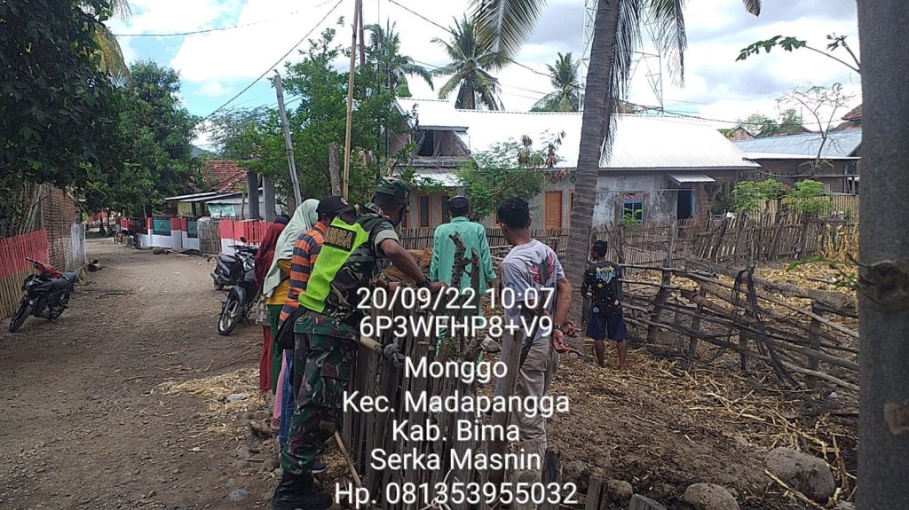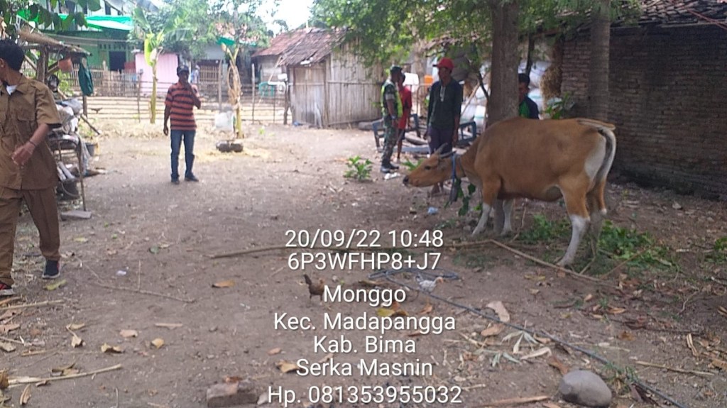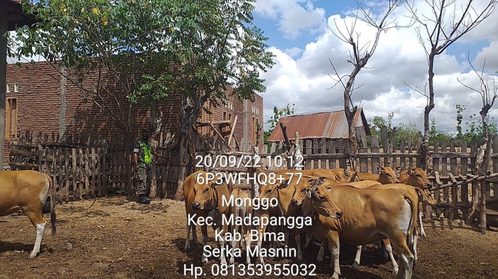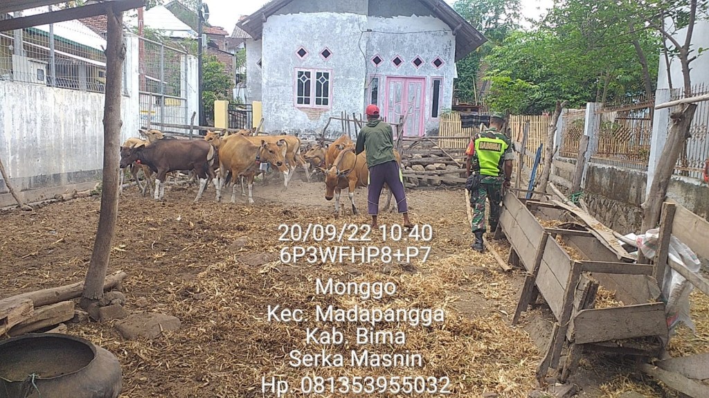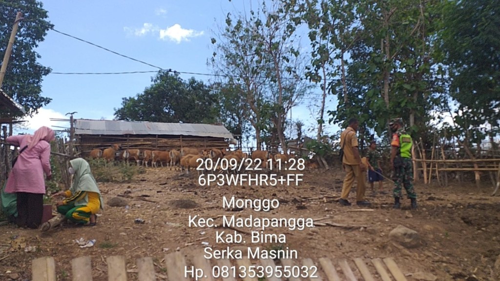 Bima – Babinsa Monggo Serka Masnin Anggota Koramil 1608-02/Bolo Kodim 1608/Bima mendampingi Tim Kesehatan Hewan melaksanakan pencegahan penyebaran wabah Penyakit Mulut dan Kuku dengan melakukan penyuntikan Hewan ternak Warga.