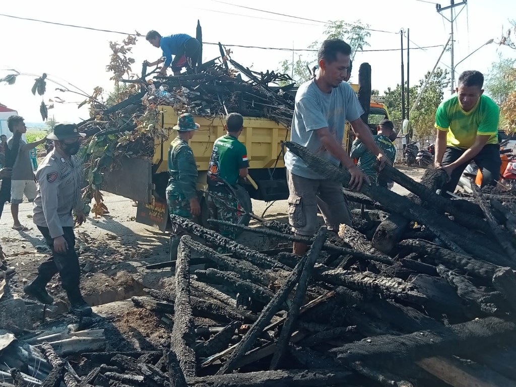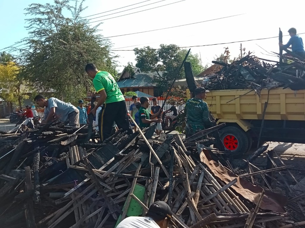 Kegiatan ini dipimpin oleh Danpos Ramil Lambu Peltu Abdullah dengan melibatkan Anggota Babinsanya dan Aparat Desa setempat bergotong royong membersihkan sisa puing-puing bangunan 11 rumah warga yang terbakar beberapa waktu lalu.