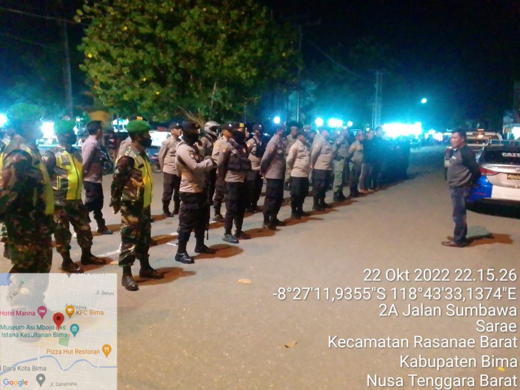Apel Patroli Gabungan ini di pimpin oleh Kabag Ops Polres Bima Kota Kompol Nusra Nugraha,S.H dengan jumlah personil 63 Orang yang terdiri dari 5 Personil dari Koramil – 01/Rasanae, 40 Personil dariPolres Bima Kota, 6 Personil Sat Pol PP serta 12 Personil dari Kantibmas/Pok Darwis.